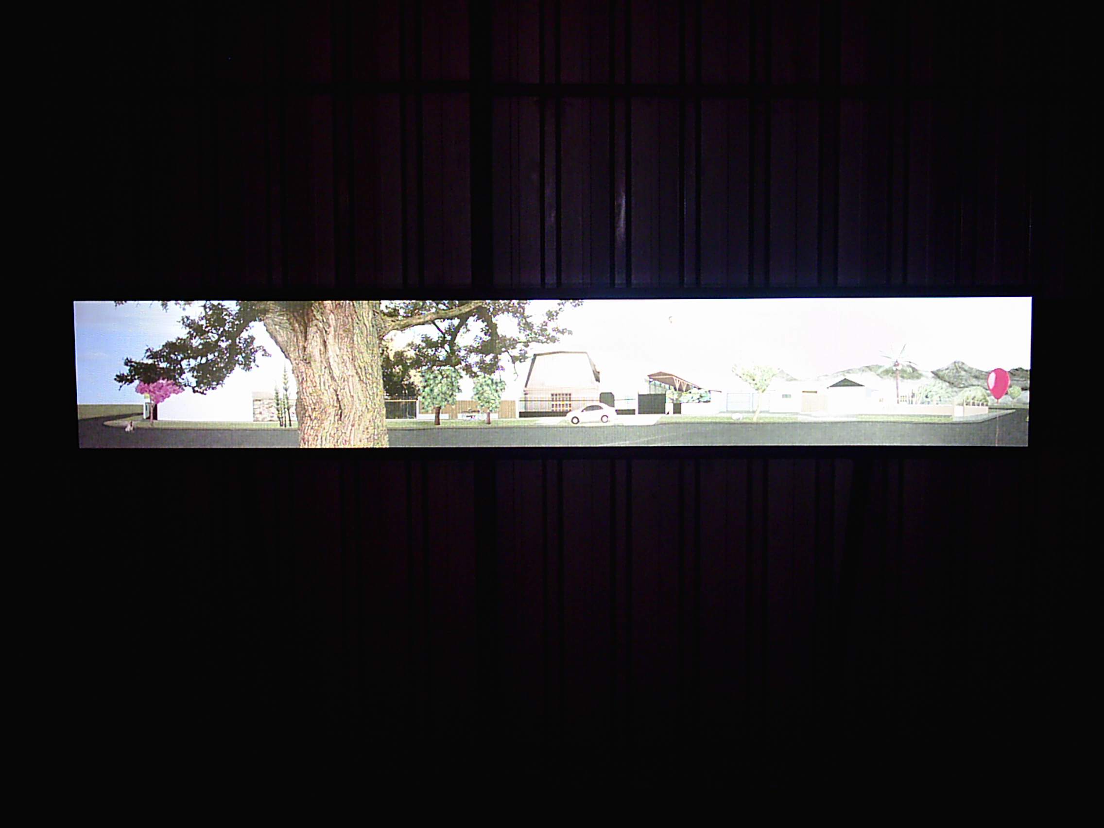 Montaje de una caja de luz que contiene una impresión digital en tela PVC Backlight de dos metros cuarenta por cuarenta centímetros, de un montaje fotográfico realizado sobre un registro de la calle Félix Mendhelsson donde se encuentra la Galería Metropolitana. El fotomontaje es realizado insertando materialidades y objetos típicamente representativos del barrio alto de la ciudad de Santiago.