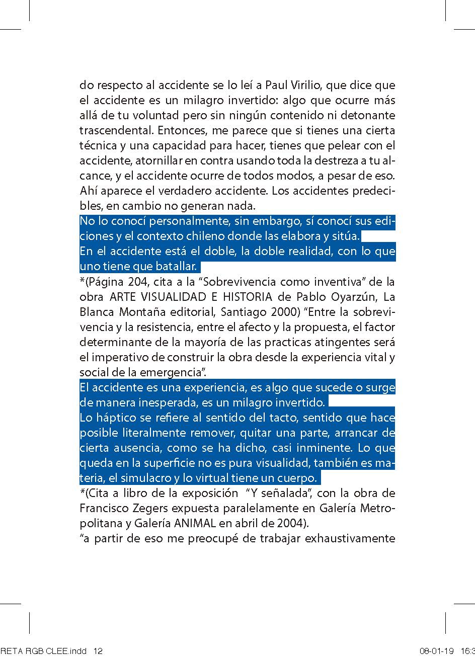 *(pag. 204 Cita a la “Sobrevivencia como inventiva” de la obra ARTE VISUALIDAD E HISTORIA de Pablo Oyarzún) “Entre la sobrevivencia y la resistencia, entre el afecto y la propuesta, el factor determinante de la mayoría de las practicas atingentes será el imperativo de construir la obra desde la experiencia vital y social de la emergencia.”